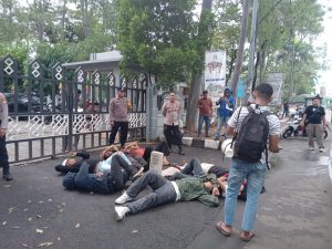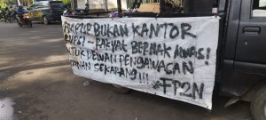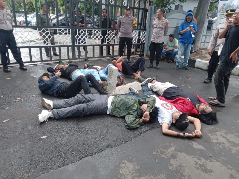 Aksi ini tak hanya menyuarakan kritik, tetapi juga menghadirkan simbolisme kuat. Beberapa peserta aksi memilih untuk berbaring di trotoar, tepat di depan pintu masuk kantor DPMPTSP, sebagai bentuk protes diam atas kebijakan yang dianggap “tidur” dari tanggung jawab pengawasan.